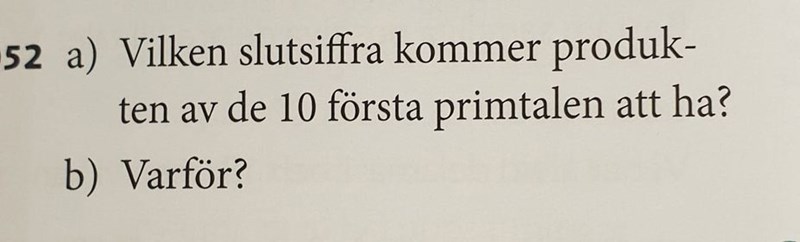 Skriv en rubrik som beskriver trådens innehåll, så blir det lättare att hitta den, och bättre ordning på forumet. Ett förslag är "Slutsiffra efter att ha multiplicerat tio primtal". Du kan ändra din rubrik i två timmar genom att trycka på "Redigera"-knappen. /moderator