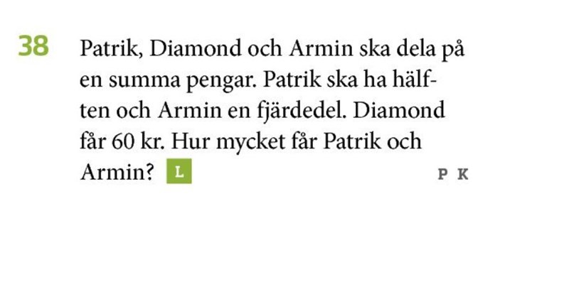 Försök att med hjälp av detta skriva ett skriva ett uttryck som beskriver hur mycket Patrik ska få och ett annat uttryck som beskriver hur mycket Armin ska få.