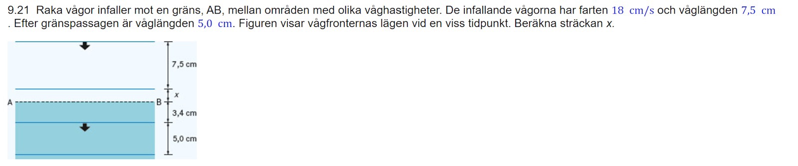 Tack för din svar men jag förstår att våglängd ska ändras efter gränsenlinje men jag förstår inte hur tid för infallande vågfront för x är samma tid for den ändra vågfront 5-3,4=1,6 cm