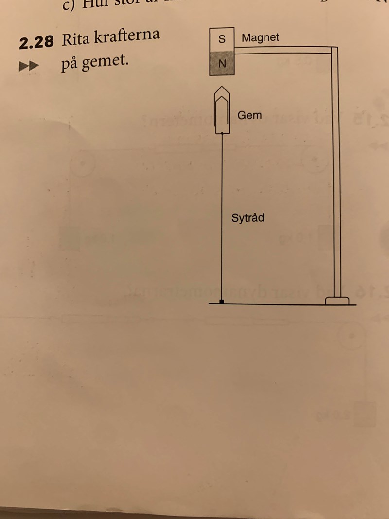 Varje sak som påverkar gemet har en kraft, dvs gravitationen påverkar så den har en pil. Magneten drar i gemet eftersom det är magnetiskt så den har en kraft och snöret stoppar gemet från att fastna på magneten så den har också en kraft.
