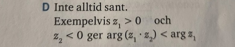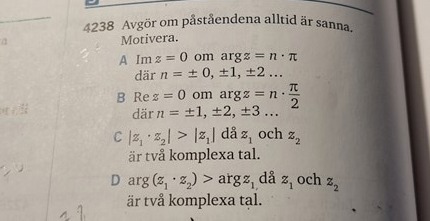 I facit står det exempel med z<0 och om z>0 men samtidigt sägs att olikheter inte funkar för z om de är icke reella? Gällande påstående D.