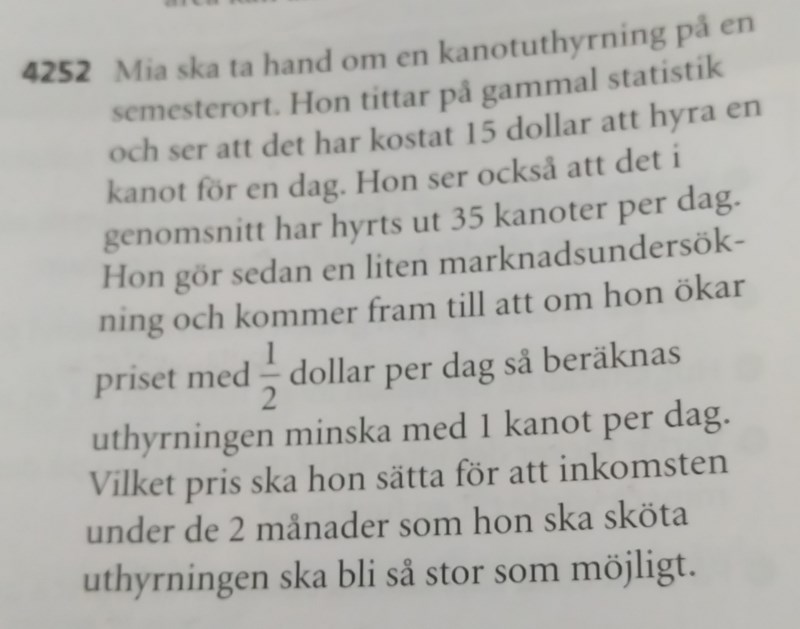 Jag har tänkt om x är antal dagar man hyr så är Priset=15+0.5x och inkomsten är (15+0.5x)*35.