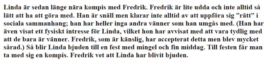 Det etiska dilemmat Linda står inför är att hon är osäker på om hon bör bjuda med Fredrik på middagen då han kan tolka inbjudan som ett ömsesidigt intresse från Lindas del. Å ena sidan vill Linda inte såra Fredrik genom att inte bjuda med honom. Å andra sidan vill Linda ha med någon som är mer social kompetent som skulle lätta till stämningen på festen.