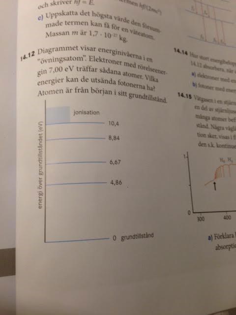 smaragdalena skrev :Vilka två energinivåer är det som ligger tillräckligt nära grundtillståndet för att det skall räcka med 7 eV för att elektronen skall kunna hoppa dit?