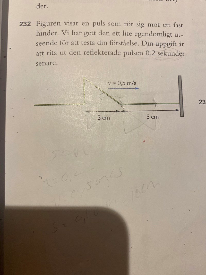 jag förstår inte denna uppgiften. För det första förstår jag inte av bilden var den inkommande pulsen befinner sig. Jag förstår dock att jag måste räkna ut var den inkommande pulsen har för sträcka efter 0,2 s. Enligt formeln sträcka=hastighet•tid.