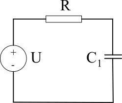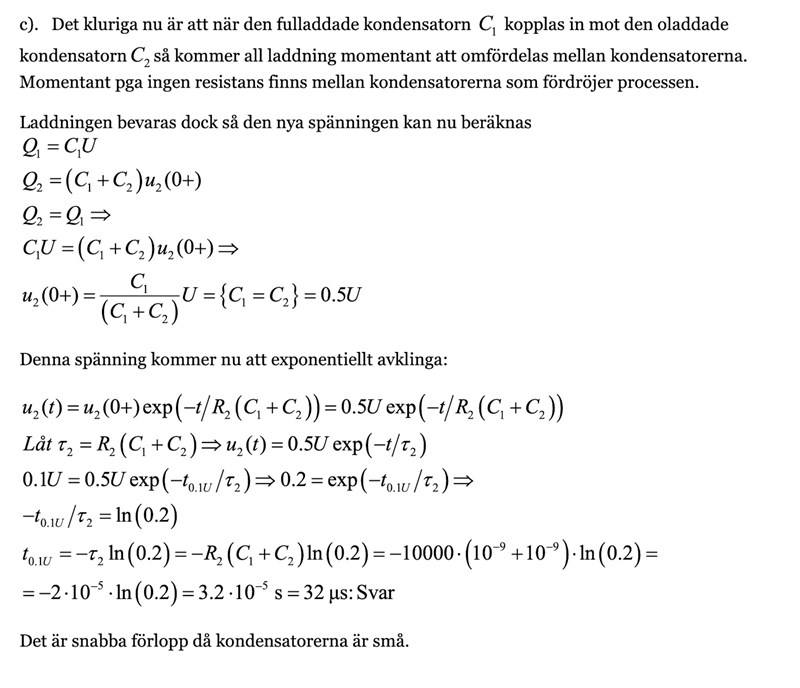 Laddningen på blir då . Den andra delen av kretsen deltar inte eftersom den andra brytaren är öppen. Dessutom flyter ingen ström genom kretsen (kondensatorn är fullt uppladdad) och därmed är spänningen över kondensatorn . Är du med på det?