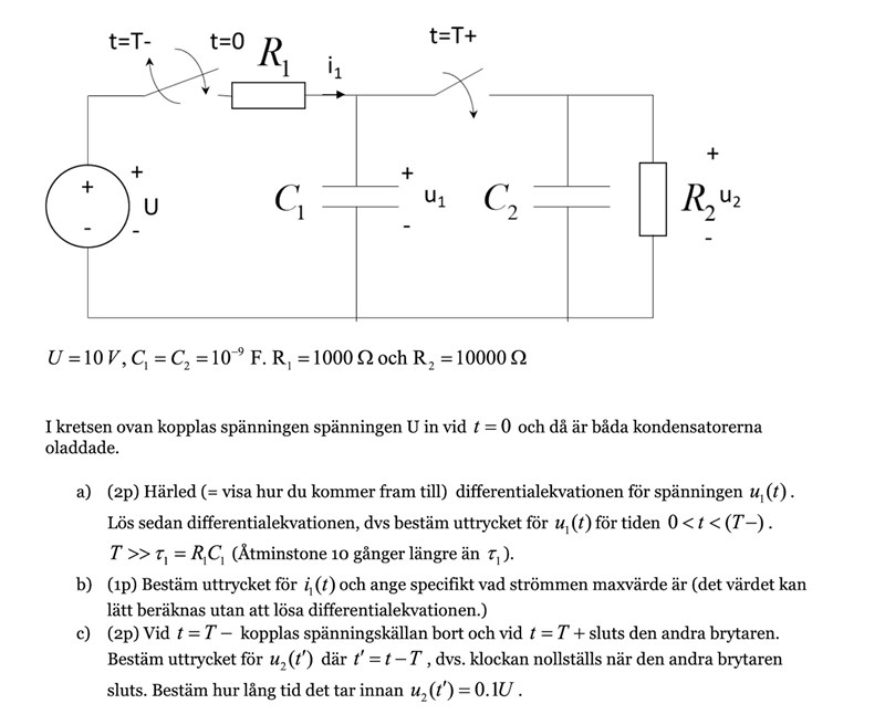Du behöver alltså bestämma konstanten , initialspänningen. Den ges genom att du beräknar hur stor spänning som ligger över kondensatorerna till följd av laddningen precis när den andra brytaren sluts.