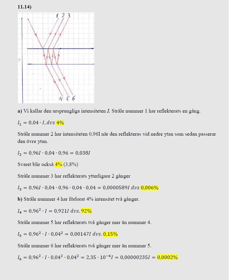 Varje gång strålen träffar gränsytan så reflekteras en andel R = 4 % och en andel T = 1 - R transmitteras.