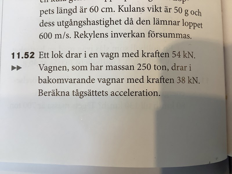 Jag tänkte att loken drar båda vagnen med en massa på 54kN och sen kan jag ta reda på accelerationen.