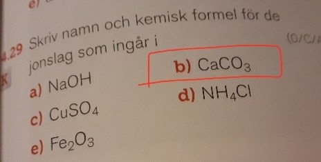 Och jag förstår inte uppgiften b). I facit får jag veta att det hela handlar om kalciumjoner, Ca^2+, och att det handlar om karbonatjoner, CO 2-(uppe) & 3(nere).