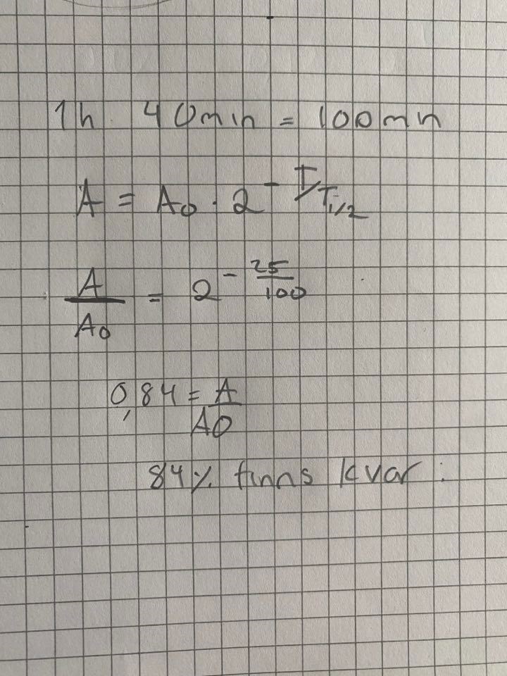 Du har helt riktigt skrivit formeln A = A0.2-T/T½ men sedan har du satt in att T=25 och T½ = 100 när det skulle vara tvärtom. 100 minuter är ju 4 halveringstider, så det finns 1/16 kvar av vad det fanns från början.