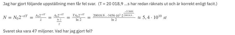 Du har räknat ut , vilket är antalet kvarvarande kärnor efter 5 timmar. Antalet sönderfall under de fem timmarna måste bli antalet kärnor från början minus antalet kvarvarande kärnor efter 5 timmar, dvs