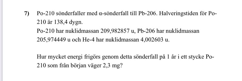 Hej! Jag har försökt lösa denna uppgift ett tag nu men kommer inte vidare. Jag har lyckats lösa ut antalet kärnor. Nästa steg enligt facit är att beräkna sönderfallet och sedan andelen energi vilket jag inte lyckats med. Jag vore mer än tacksam för hjälp.
