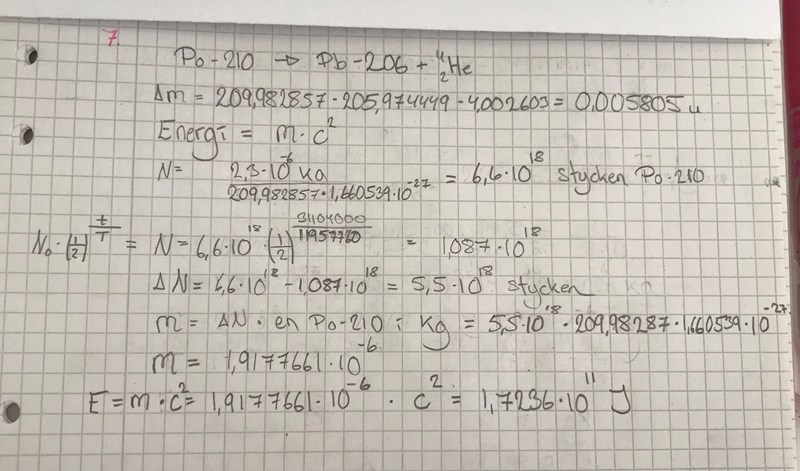 På första två raderna räknar du tydligen ut hur många u som omvandlas till energi när en polonium-kärna sönderfaller.