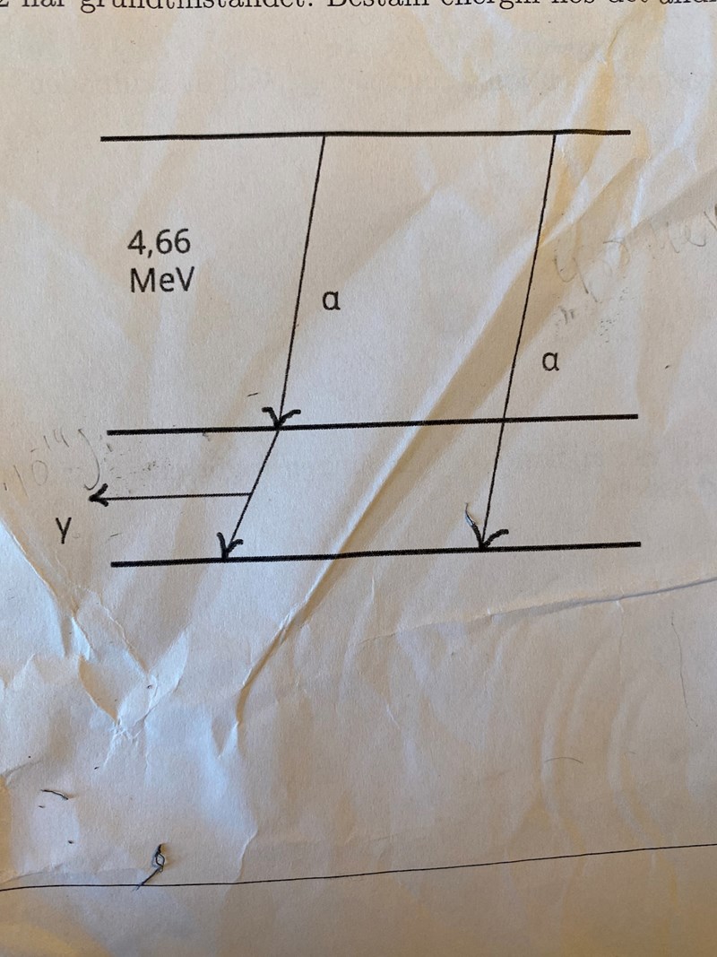 Ra-226 sänder ut alfapartiklar med två olika energinivåer enligt diagrammet. Det ena sönderfallet (4,66MeV) följs av gamma strålning med frekvensen 4,52*10^19 Hz varefter dotter partikeln Rn-222 når grundtillståndet. Bestäm energin hos det andra sönderfallet, svara i MeV.