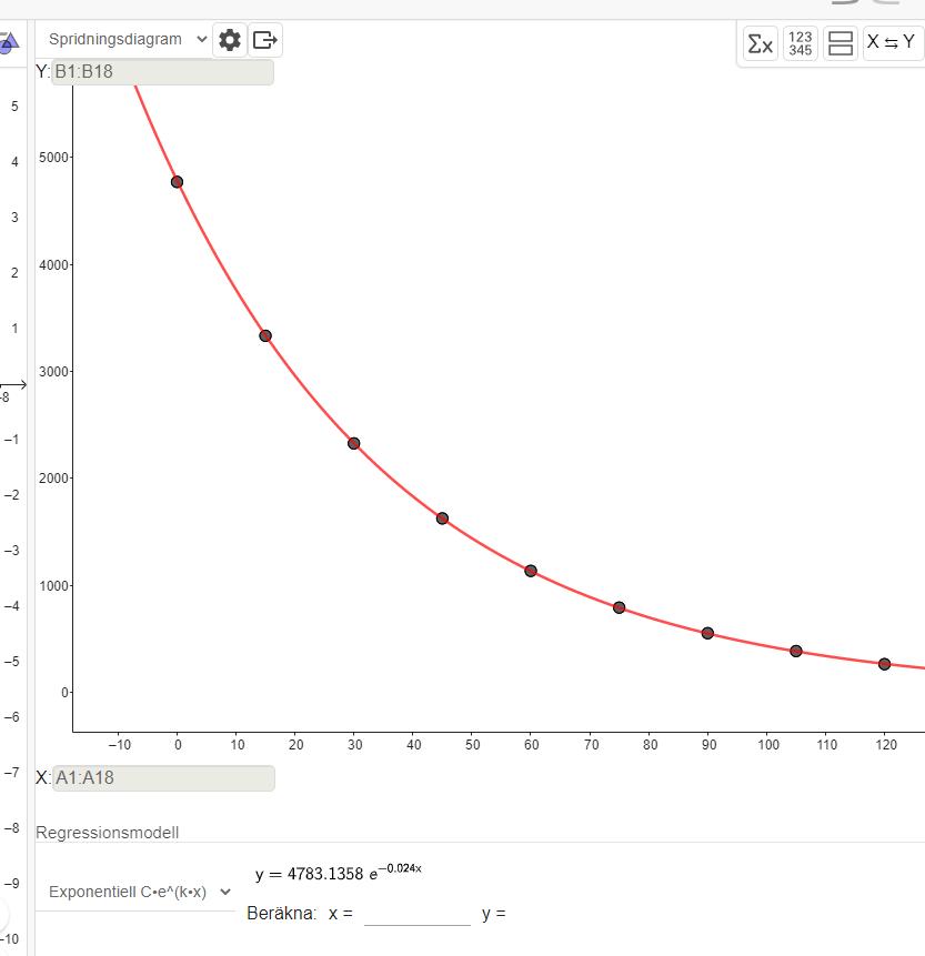 Jag sätter in A = 4783/2 vilket blir 2391,5 och har kvar A0 som startvärdet dvs. 4683. Men sedan förstår jag inte hur jag ska göra för att lösa ut halveringstiden....