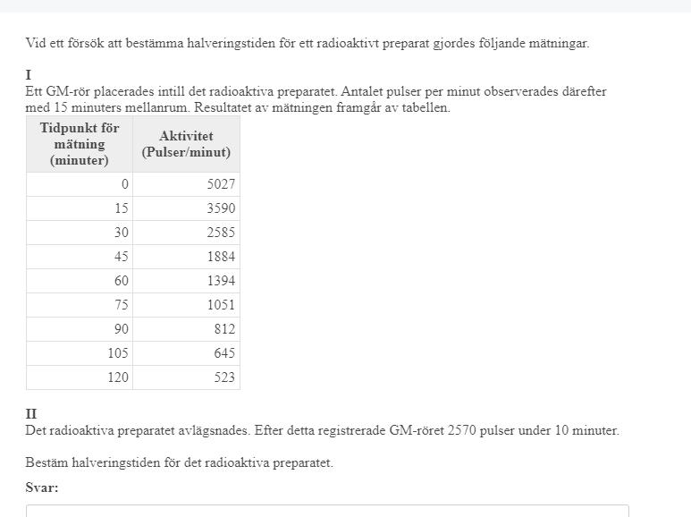 det står ju att finns kvar 2570 pulse ämnet efter 10 minuter det är bara och sätta in de värderna. du ska nog använda dig av att vid tiden 0minuter så och efter 10 minuter då får du ut halveringstiden.