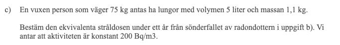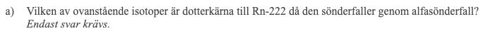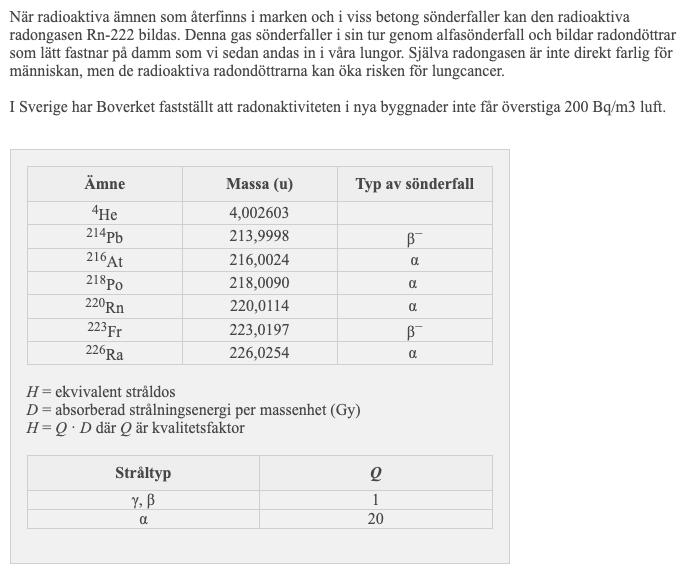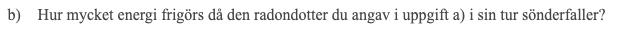 Hej! Jag har gjort denna uppgift (bild nedan) så många gånger nu och kommer ändå fram till samma svar som är fel. Fråga a fick jag rätt på vilket var Po-218. Sedan är det b som jag om och om igen får fel på. Jag började med att skriva en reaktionsformel: Po-218 --> Pb-214 + He-4. Sedan räknade jag ut energin på vardera sida pilen med hjälp av massorna i tabellen som jag konverterade till kg och sedan stoppade i formeln E=mc^2. Däremot fick jag båda sidor till att bli 32,53nJ vilket innebär att den frigjorda energin är 0... Vad gör jag för fel? Tack på förhand!