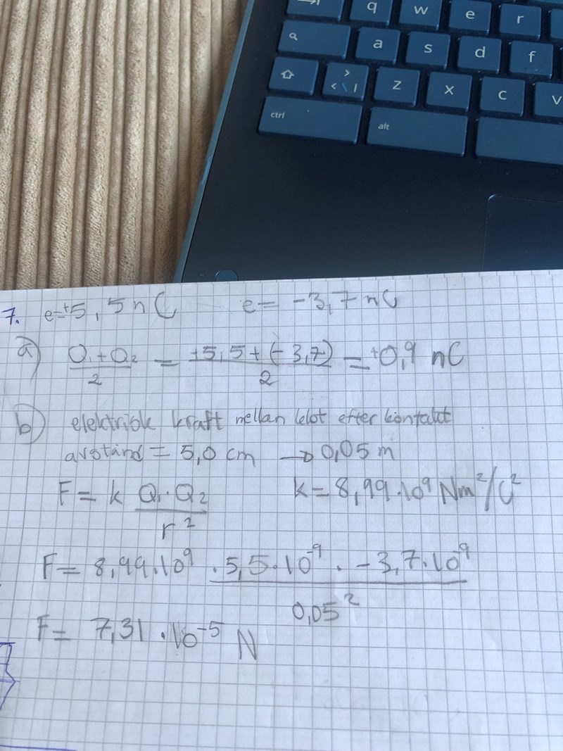 b)Beräkna den elektriska kraften mellan kloten efter kontakten, på 5,0
