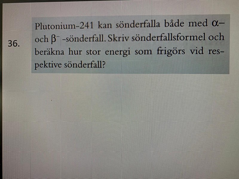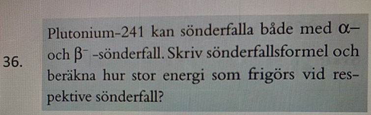 Smaragdalena skrev:Jag tror inte att du kommer att behöva veta vilken sorts sönderfall det blir för en viss nuklid, åtminstone inte utan att ha tillgång till en nuklidkarta, där detta står.