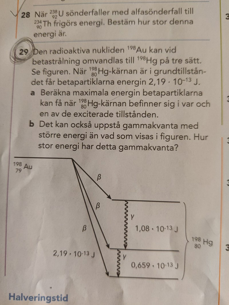 Och där ser man att nästan alla sönderfall går till det mellersta tillståndet. De andra två har mycket lägre sannolikhet. Men det behöver man inte veta för att svara på uppgiften. Använd bara energins bevarande.