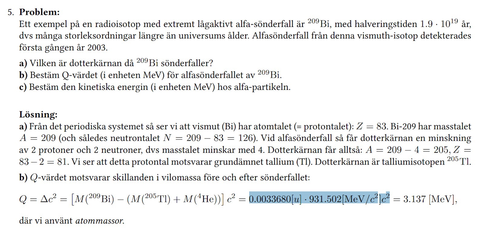Hur blir massskillnaden 0.003368? Jag räknade ut det och fick 208.98040-204.3833-4.002602=0.594498 u