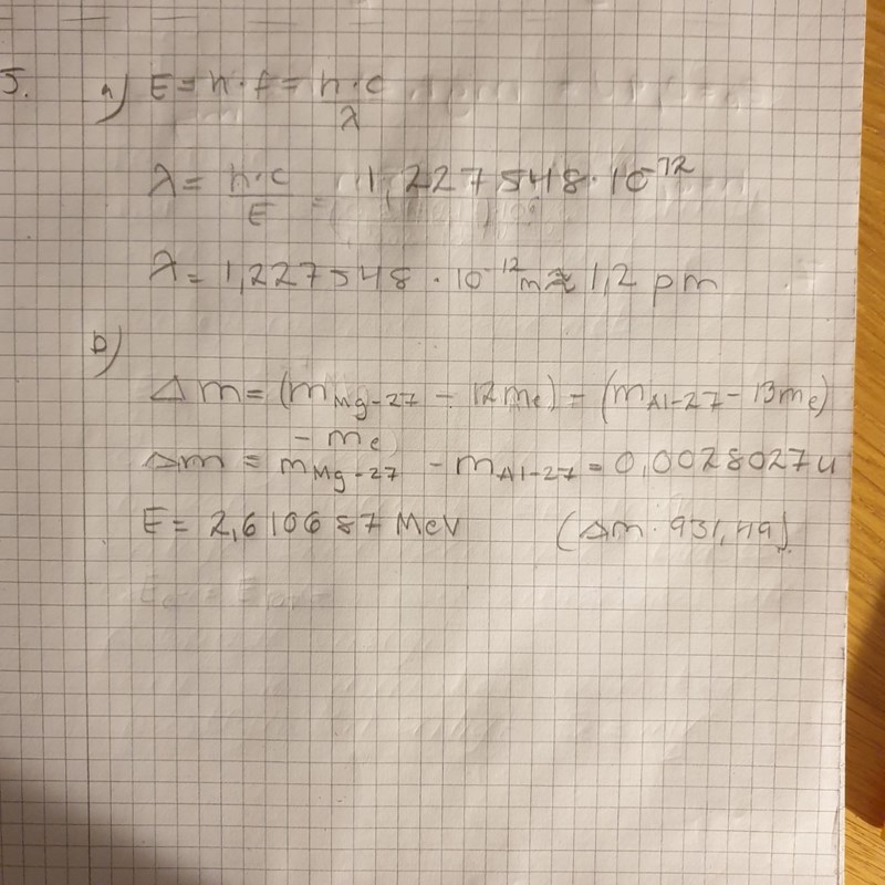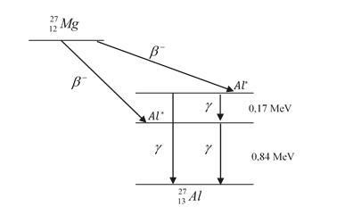 Mg-27 utsänder enligt sönderfallsschemat. Nuklidmassorna är 26,9843407 u för Mg-27 respektive 26,981538 u för Al-2