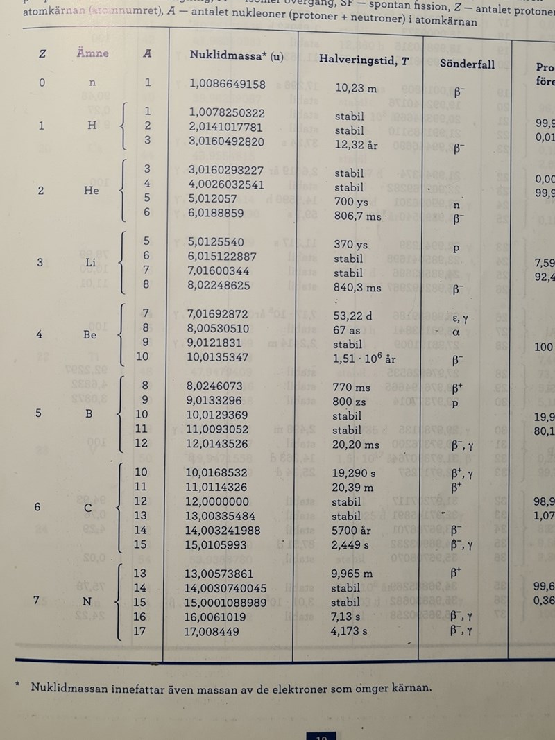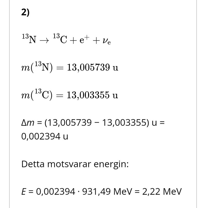 Partykoalan skrev:Här står 1,73 MeV som jag fick men även 2,75 MeV som boken fick. Man ser även hur många procent av vardera värde som sker och det visar att 99,9% blir 1,73 MeV (b+ sänderfall).