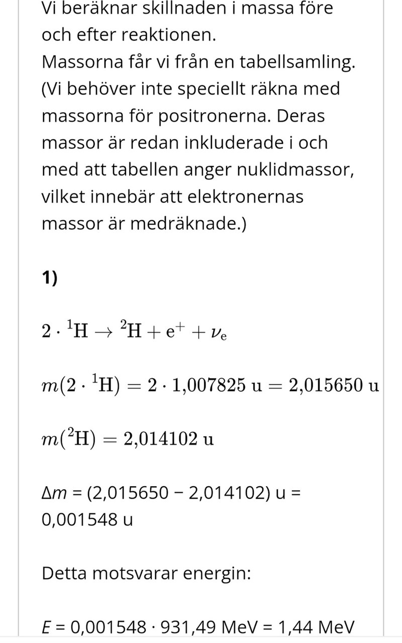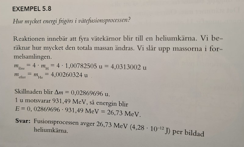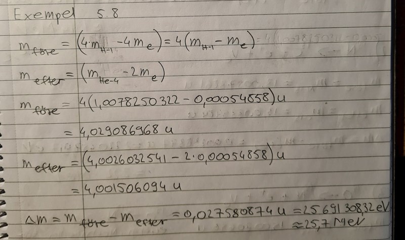 och fick ca. 25,7 MeV eller 4,12 pJ utan att dra bort 2 elektronmassor (positronmassor) som finns i formeln. Alltså precis som exemplet gjorde.
