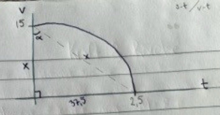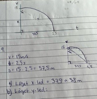 Jag fick svaret 37,5m med hjälp av s=v*t men man kunde även räknat ut det med formeln för läget i x-led.