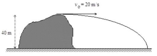 Från en platå på höjden 40 m över omgivningen skjuter man iväg en liten kula med hastigheten = 20 m/s. Riktningen är horisontell, som figuren visar.Bortse från luftmotståndet vid beräkningarna.