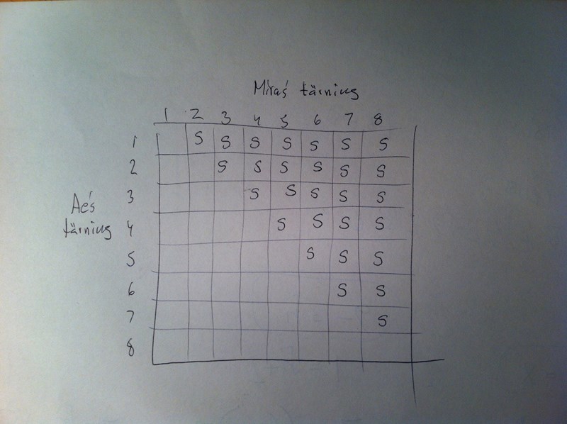"S" i en ruta betyder att Mira har slagit ett större tal på sin tärning.