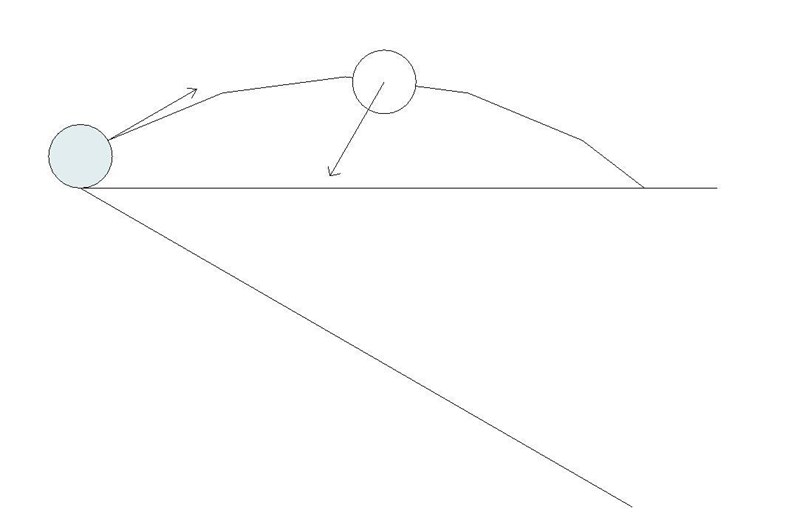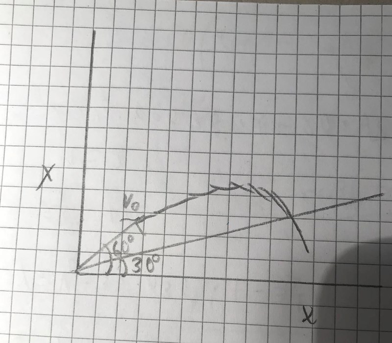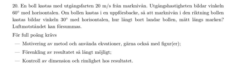 Mitt resonemang: Eftersom backen bildar 30 med horisonten och utgångshastigheten bildar vinkeln 60 med horisonten borde man kunna se det som att backen är horisonten och att utgångshasigheten då bildar 30 med backen eftersom man ändå ska räkna hur långt bort bollen landar, mätt längs marken. Var är jag feltänkt? Tack på förhand