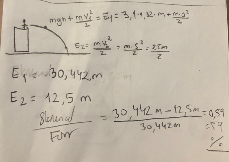 Vi fick en uppgift där vi skulle beräkna hur mycket energi som förloras genom friktion om man kastar en boll rakt uppåt. Bollen kommer 3,1 m upp innan den vänder och dess ursprungs hastighet är 5,0 m/s.