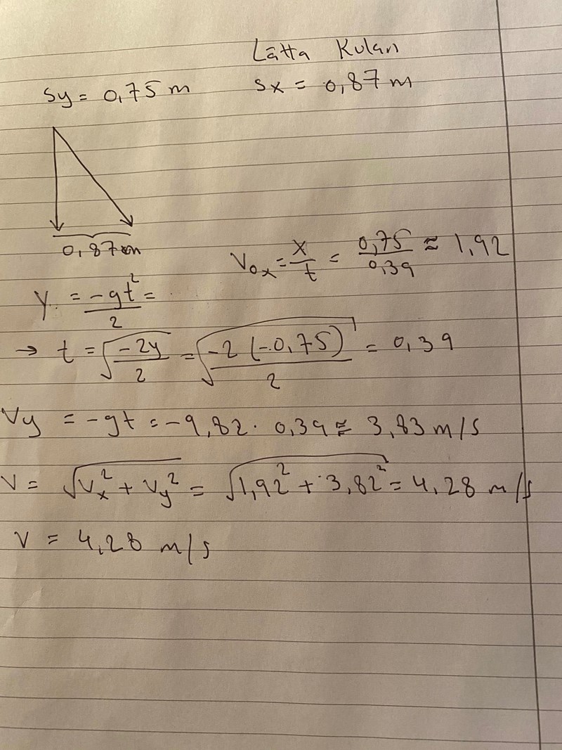 Hej, vi har utfört en laboration där vi använder två kulor med olika massa en lätt och en tung. Den ska med hjälp av en kulbana rulla ner och bordets höjden och kulans horisontella vägsträcka sx (vägsträckan i x-led) mäts med måttband sy (vägsträckan i y-led) mäts också med måttband.