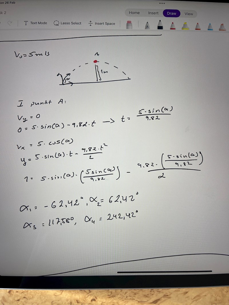 Fråga: Bestäm vinkel alfa så att bollen nätt och jämt passerar hindret på 1 m höjd, där den når sin högsta höjd. Utgångshastigheten är 5m/s
