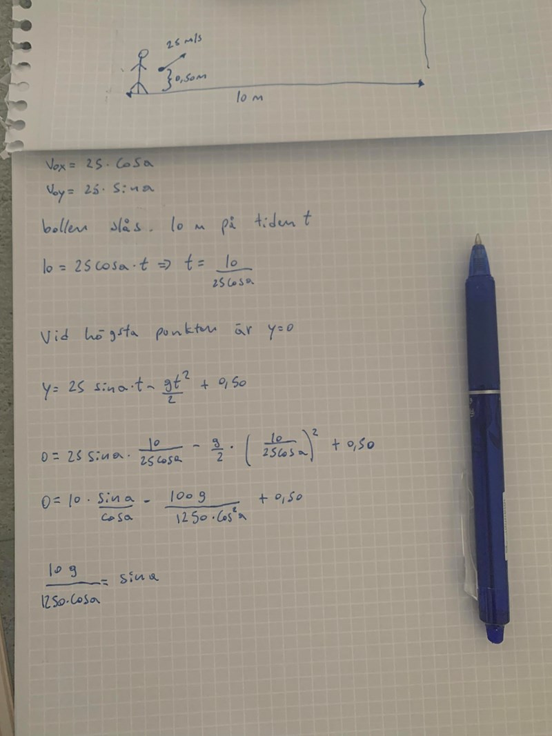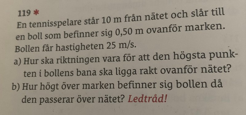 ”Kan du hitta ett uttryck som ger hur lång tid det tar för bollen att hinna fram till nätet som en funktion av vinkeln?”