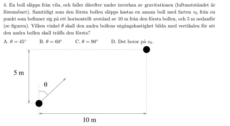Vid vinklar borde man då alltid kunna hitta ett för att bollarna ska träffa varandra.Nej, någon sådan hastighet finns inte. Jag utmanar dig att hitta en hastighet som leder till kollision mellan bollarna för . Då har nämligen den vänstra bollen 5 meters försprång i vertikal led och båda bollarna accelererar mot marken med samma acceleration . Den högra bollen kan därmed inte hinna ikapp den vänstra bollen i vertikalled.