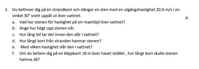 Guggle skrev :Ja, lite beroende på hur du ställt upp din ekvation för rörelsen i y-led kan du sätta y=-18 för att hitta t. Uppgift f och uppgift c är ungefär samma sak.