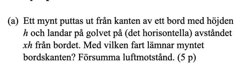Jag vet att fart inte är samma sak som hastighet, men vet inte vad det innebär. Jag får uttrycket för v(x,i)= xh/t, tänkte att jag behöver även uttryck för v(y,i) men enligt bilden hur myntet kastas verkar v inte ha någon y komponent då.