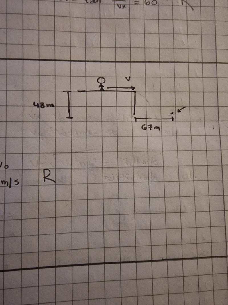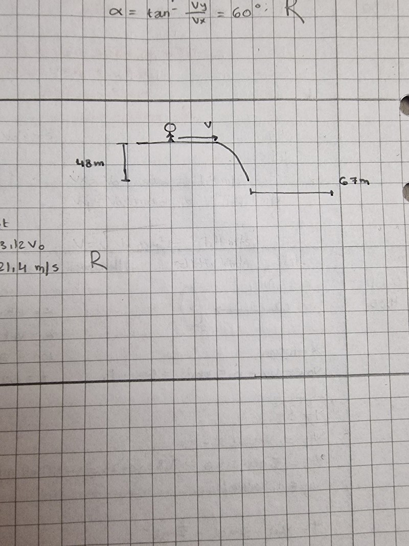 Jesper, som är stuntman, kör sin motorcykel horisontellt ut från en 48m hög klippa. För att landa säkert måste han landa minst 67m ut från klippan. vilken är den minsta hastigheten han då behöver ha? bortse från luftmotståndet.