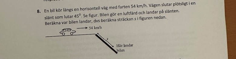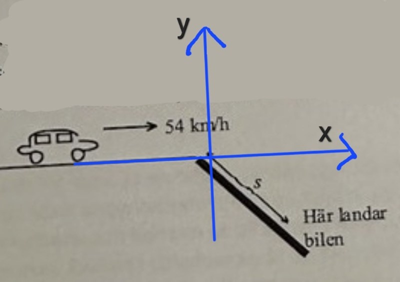 För att förenkla problemet begreppsmässigt så skulle jag börja med att införa ett xy-koordinatsystem där origo placeras vid bilens "uthoppspunkt".