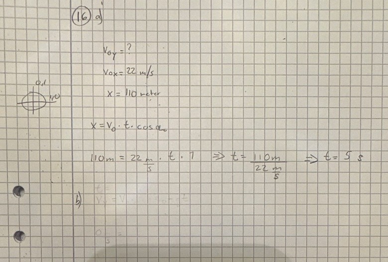 På c) så saknas vinkeln och hastigheten v, för att kunna tillämpa trigonometri. Är det så att man ska använda v=s/t för att få v(dvs hypotenusan). S=110 m och t=5 sek