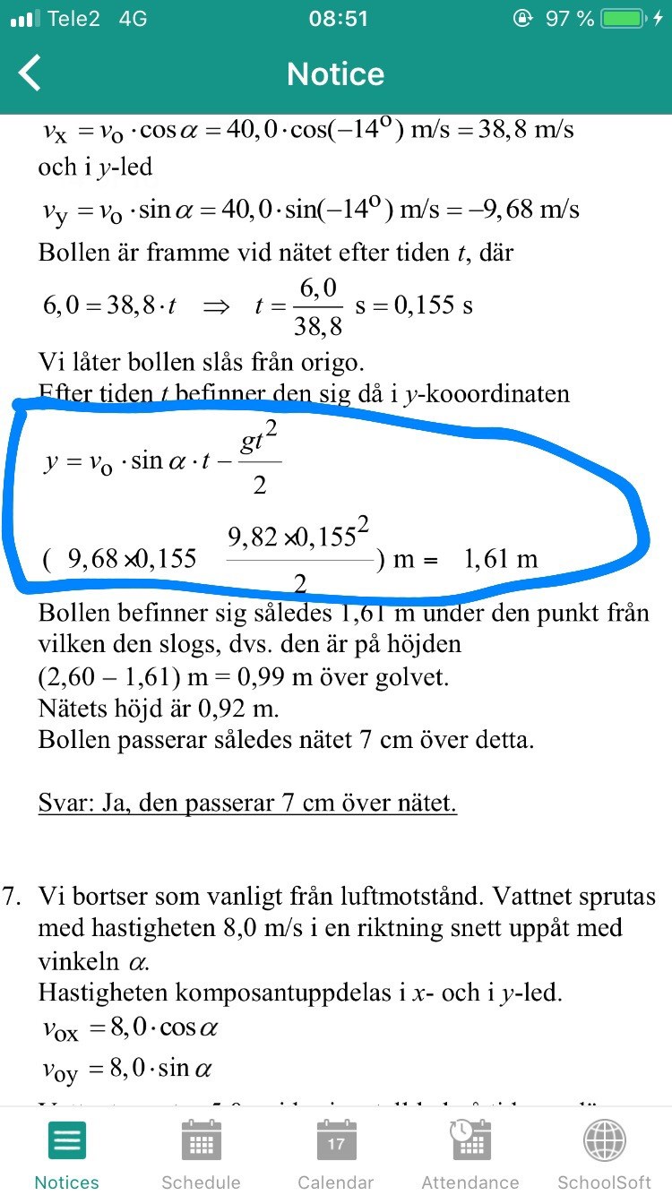 Jag har förstått att jag ska räkna ut hastigheten i x-led och sedan y-led. Jag räknar sedan ut tiden genom att dela sträcka/vx. Dock förstår jag inte hur i lösningarna här de kommer fram till 1,61 och varför man tar bort sin alpha. Kan nån snälla förklara det steget?