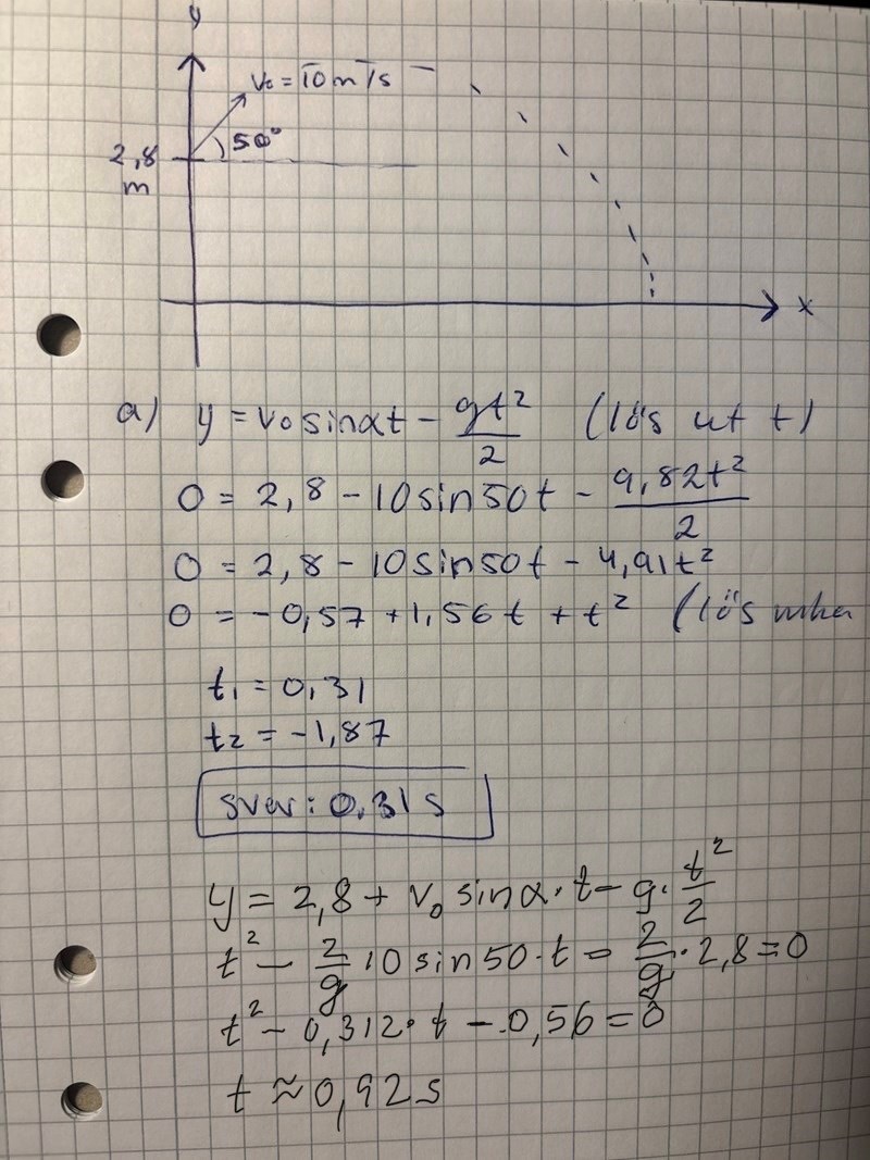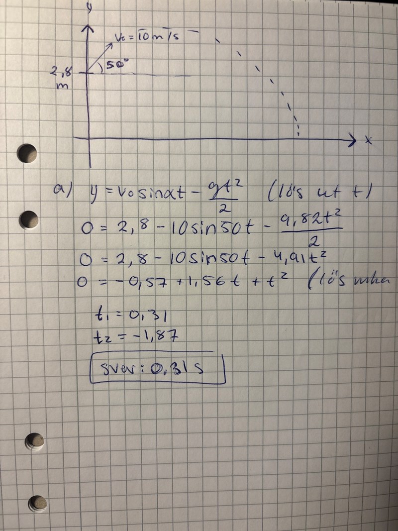 Hej! Jag förstår inte vad som blir fel. Och jag får alltid fel på just det här när jag ska avgöra om det är (i det här fallet) minus eller plus efter 2,8 m, men jag tänker att det borde vara Linus eftersom den dras ner av hastigheten och accelerationen?