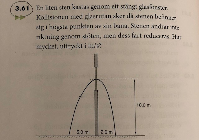HT-Borås skrev:Om inte rutan funnes skulle stenen landa 5 m från väggen, men nu blir det 2 m. Du bör tänka på hur stor hastighet vågrätt som behövs för att nå 5 m före rutan respektive 2 m efter.