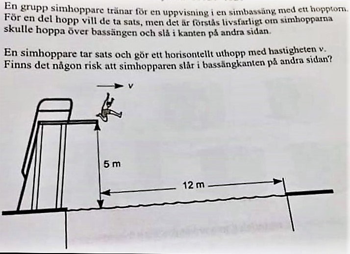 smaragdalena skrev :Ja. Vilken hastighet framåt behöver simhopparen ha för att riskera att slå i bassängkanten på andra sidan?