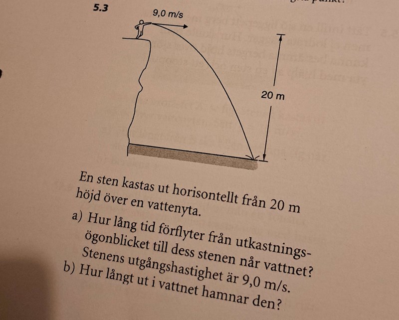 Eftersom detta kast är horisontellt så är och vi får då att och att .
