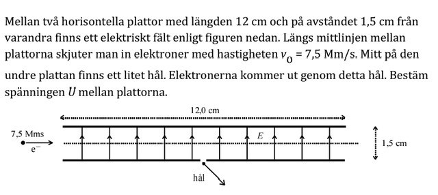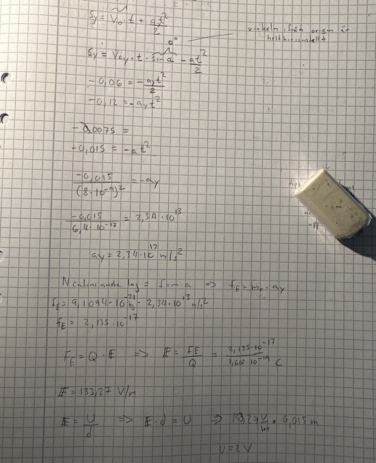 Detta har du redan tänkt enligt din lösning men ville bara sammanfatta lösningsgången. Det som blir fel i slutet är att du skriver att , vilket inte stämmer, samt att kommer med en vinkel , vilket inte heller stämmer. Den skjuts ut med en hastighet i enbart horisontellt led. Alltså gäller att men accelererar nedåt och är konstant, likt en vanlig kaströrelse.