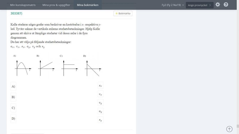 Jag har svarat A = Sy, B=Sx, C=Vx, D=Vy. Min förklaring: Vx är alltid konstant. Det kan heller inte vara ax eller ay som alternativ eftersom de skulle vara raka streck nedanför x-axeln. Sy kommer att variera som en andragradsfunktion och blir A. B, Sx kommer öka och öka. Vy kommer vara positiv (påväg upp), 0 och sedan negativ (påväg ner). Kan någon förklara Sy och Sx, då jag inte förstår dem till 100%